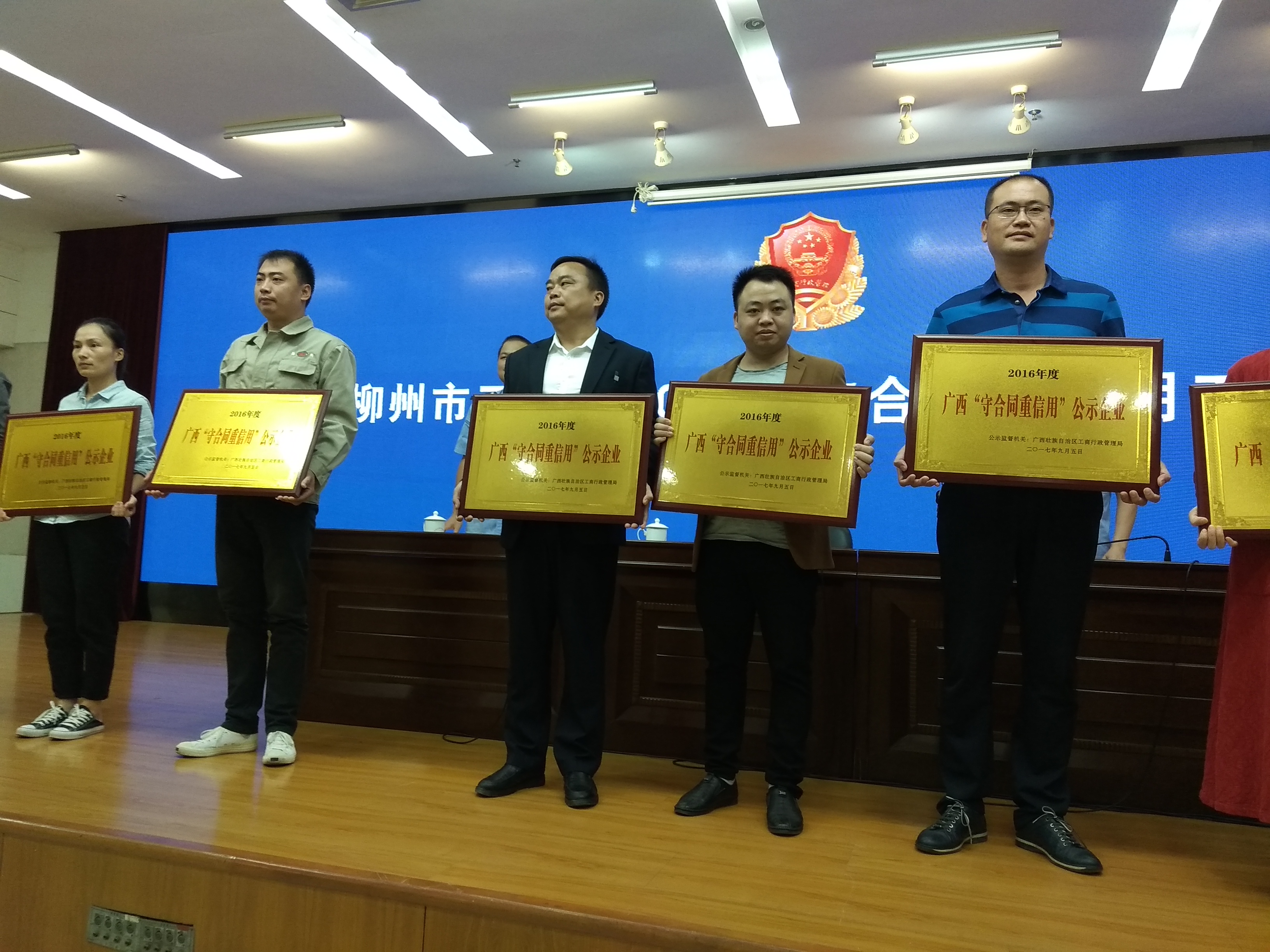 好消息!10月27日上午,在柳州市工商行政管理局召開的2017年度守合同重信用工作會議上,柳州市家居建材博覽中心有限公司榮獲了2016年度“廣西壯族自治區守合同重信用”公示企業榮譽稱號,市工商局副局長韋華廣給柳州家居領獎代表——總裁助理劉小兵頒發榮譽匾牌。此項殊榮的獲得為柳州家居再添一張亮麗名片。