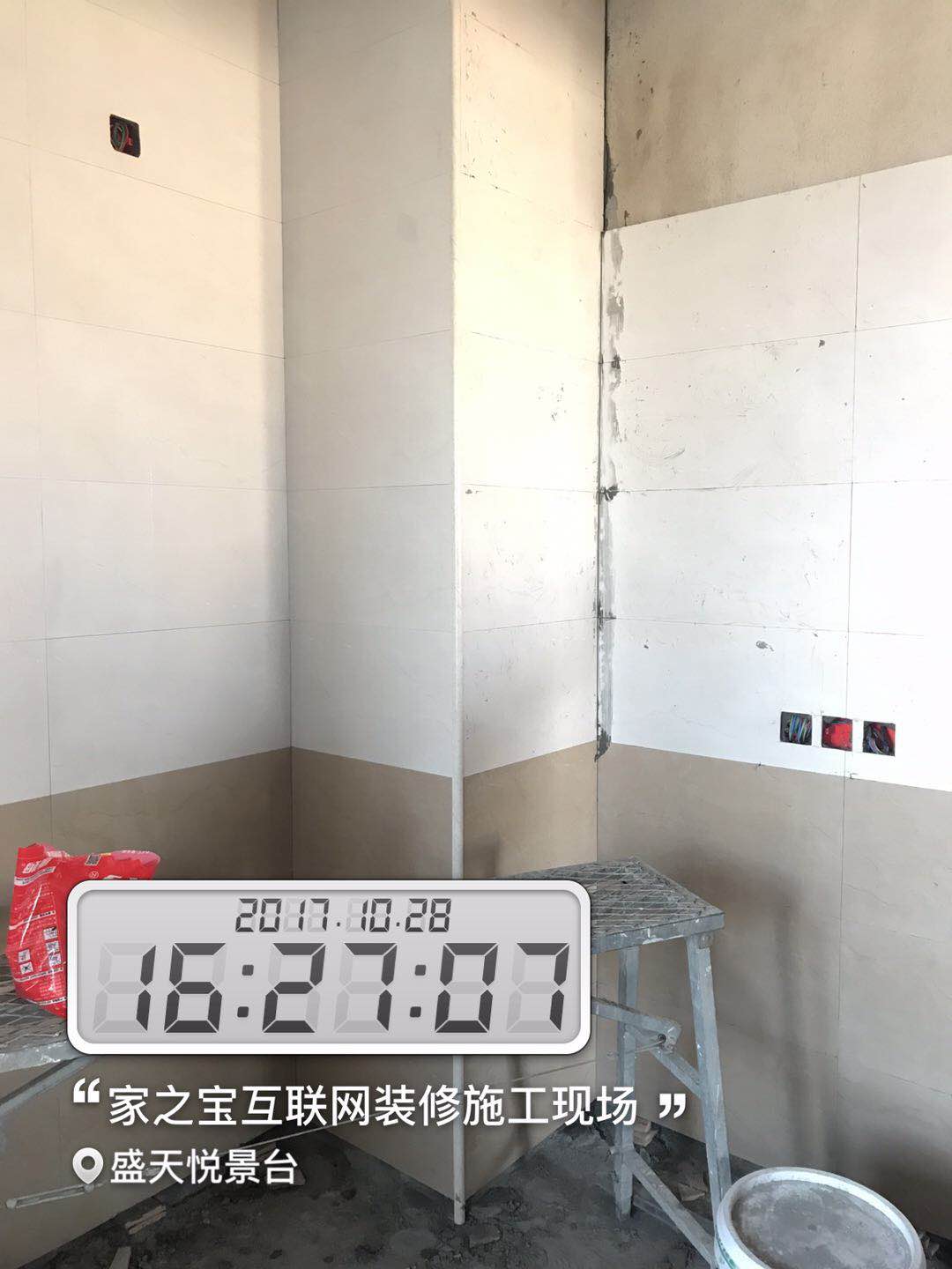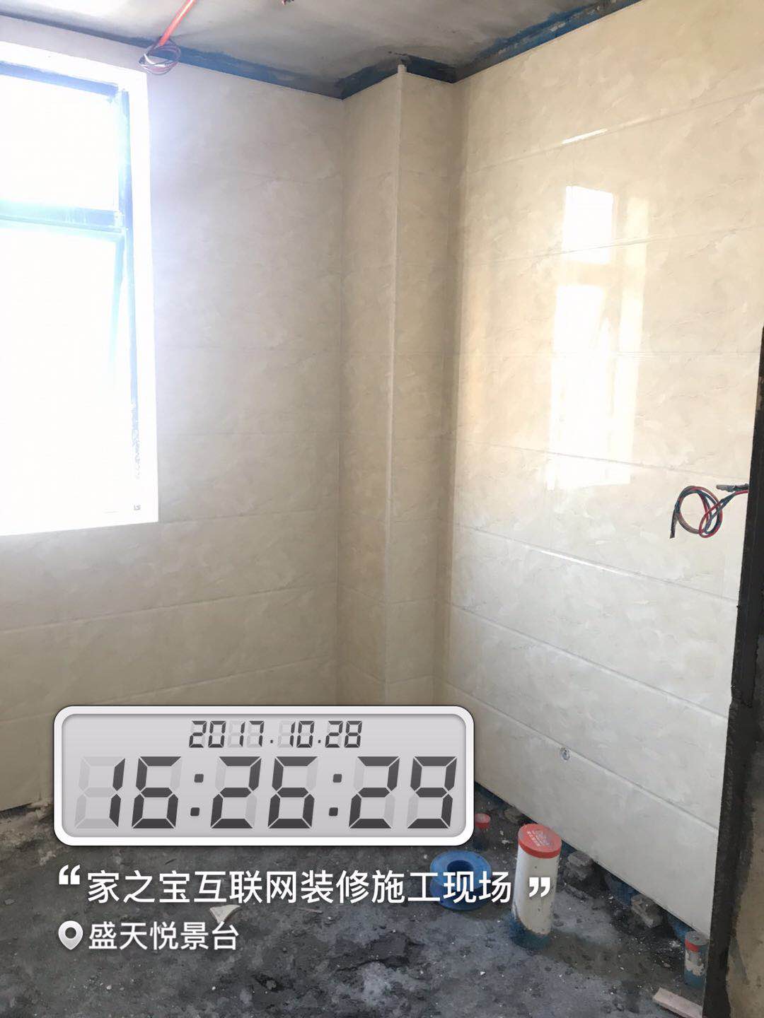 墻磚鋪貼,使用水平儀投射水平線,陽(yáng)角處采用磨邊45°碰角工藝。