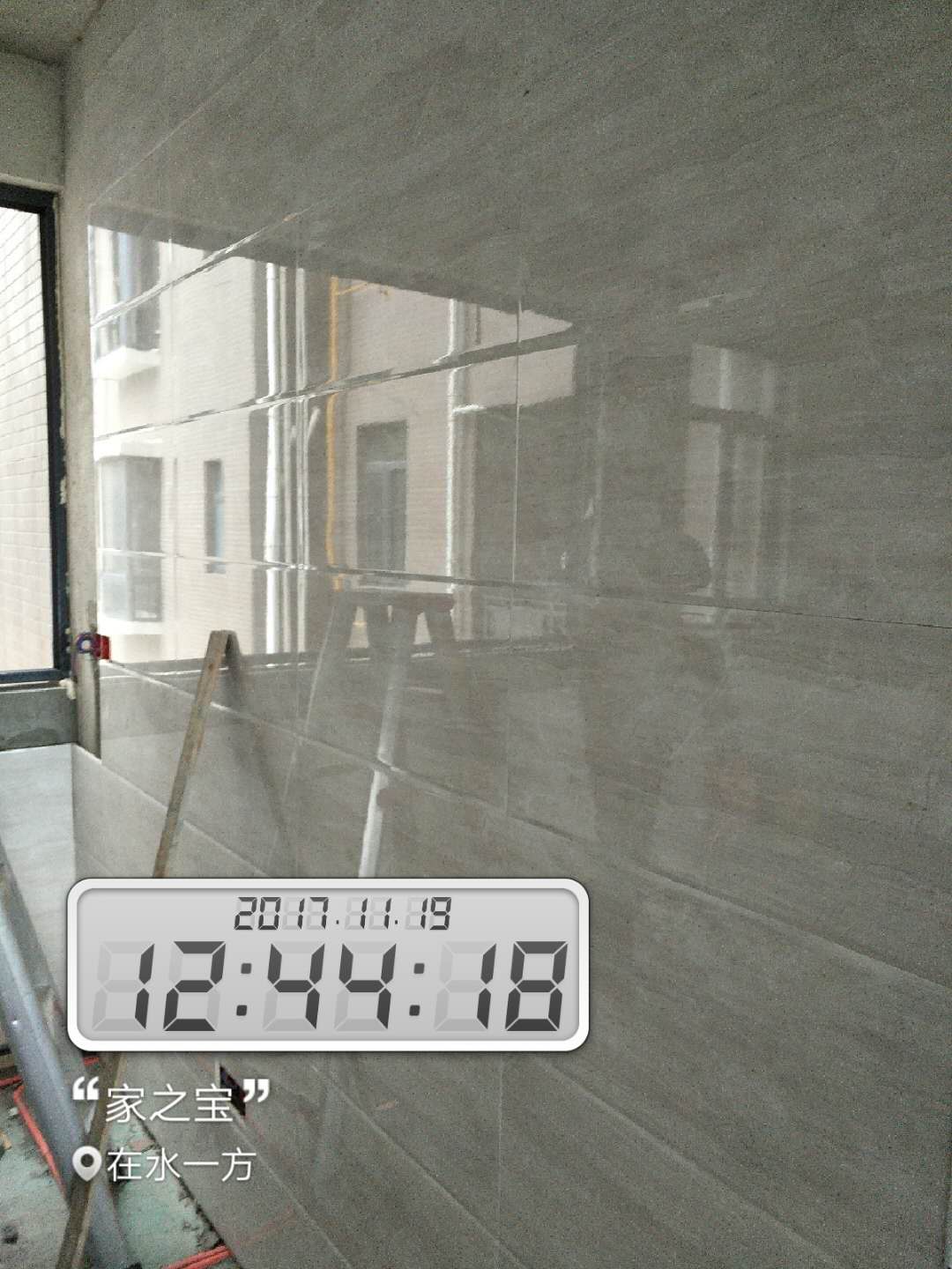 墻磚鋪貼,使用水平儀投射水平線,陽角處采用磨邊45°碰角工藝。